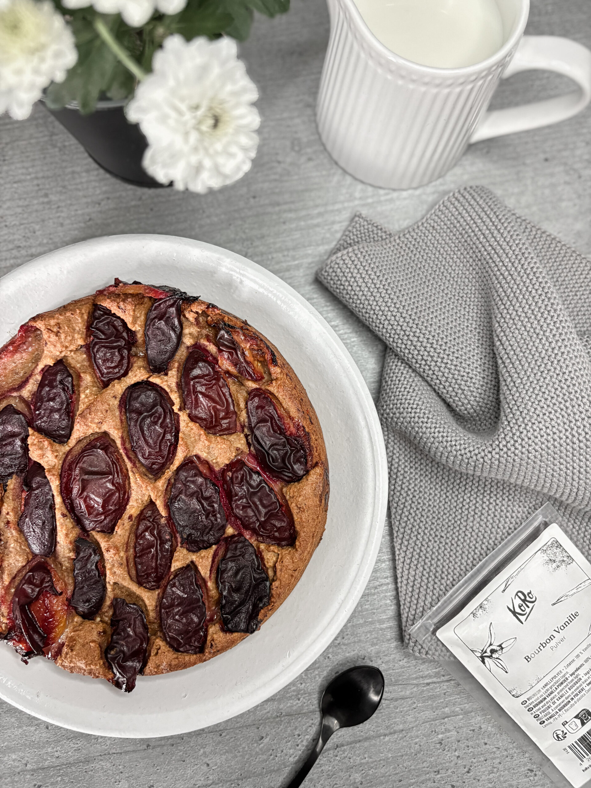 Der vegane Pflaumenkuchen besteht aus guten, natürlichen Zutaten und ist nur mit Datteln gesüßt.